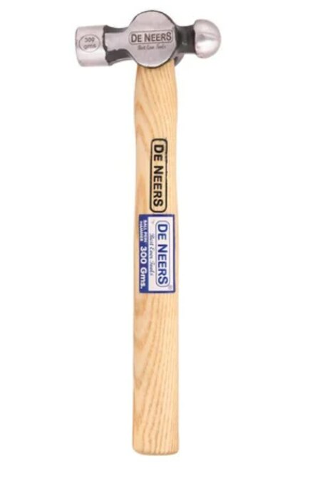 Type Of Hammer Ballpein Handle Material Ashwood Brand De Neers Country of Origin Made in India * High Quality Ashwood Handle * Drop forged from Carbon Steel * Generally confirming to IS 841-1983 * Hardened steel head for durability * Handles are made from high quality wood and fitted with metal wedge to ensure permanent fitting. * Commonly used to drive cold chisels or punches, to bend and shape, and to set rivets. * Available in other sizes from 100g to 1000g and in Cross Pein as well.