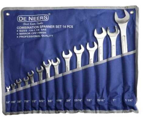 Brand DE NEERS Model Name/Number 14-14 SAE Size/Dimension SAE Usage/Application Industrial Material Mild Steel Product Type COMBINATION Warranty 1 Year Country of Origin Made in India COMBINATION SPANNER SET 1/4 to 1-1/4 SAE Set of 14 Pcs. HEAD POLISHED